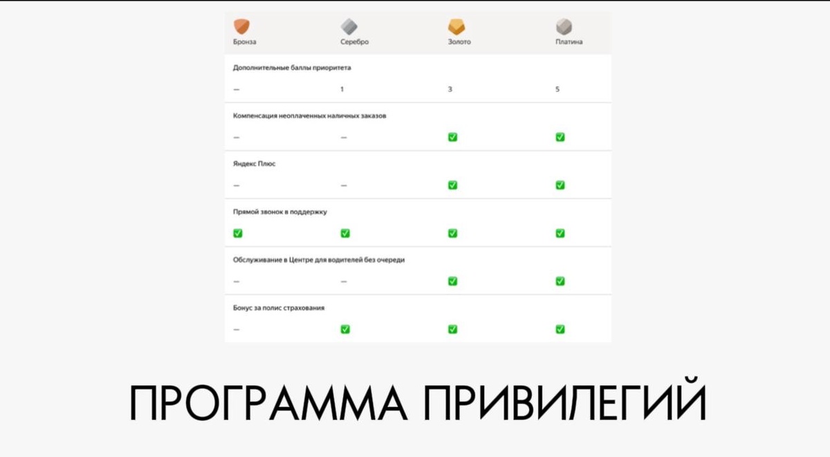 Программа привилегий даёт водителям дополнительные бонусы, приоритет и поддержку. Чем больше заказов выполняете, тем выше ваш уровень и больше преимуществ. 🔹 Как участвовать? ✅ Участвуют все водители, выполняющие заказы в Яндекс Про. ✅ За каждую поездку начисляются баллы. ✅ Баллы копятся в течение месяца, а 1-го числа следующего месяца присваивается новый уровень. ✅ Если вы ИП или самозанятый, вам начисляют +10 баллов за каждую поездку в течение 90 дней с момента регистрации. 🏅 Уровни программы: Чем выше уровень – тем больше бонусов! 🔹 Бронза — от 300 баллов 🔹 Серебро — от 3 000 баллов 🔹 Золото — от 8 000 баллов (рейтинг не ниже 4,8) 🔹 Платина — от 10 000 баллов (рейтинг не ниже 4,9) 🔥 Как узнать свой уровень? 📌 Откройте профиль в Яндекс Про — там указаны ваш уровень и количество баллов. 📌 Баллы обнуляются 1-го числа каждого месяца, и ваш уровень может измениться. Пример: 🚖 В июле вы накопили 3 500 баллов — в августе ваш уровень Серебро. 🚖 В августе набрали 8 500 баллов