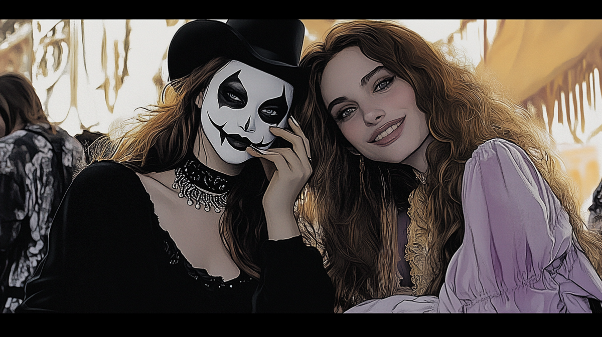 На карте мы видим двух девушек, позирующих на камеру: они будто специально выставлены на всеобщее обозрение. Улыбки выглядят неестественными, а вся обстановка наводит на мысль, что это часть постановочного шоу. С первого взгляда в их поведении присутствует игривость и даже вызывающая откровенность. Но, если приглядеться глубже, становится ясно, что это может быть всего лишь маска.