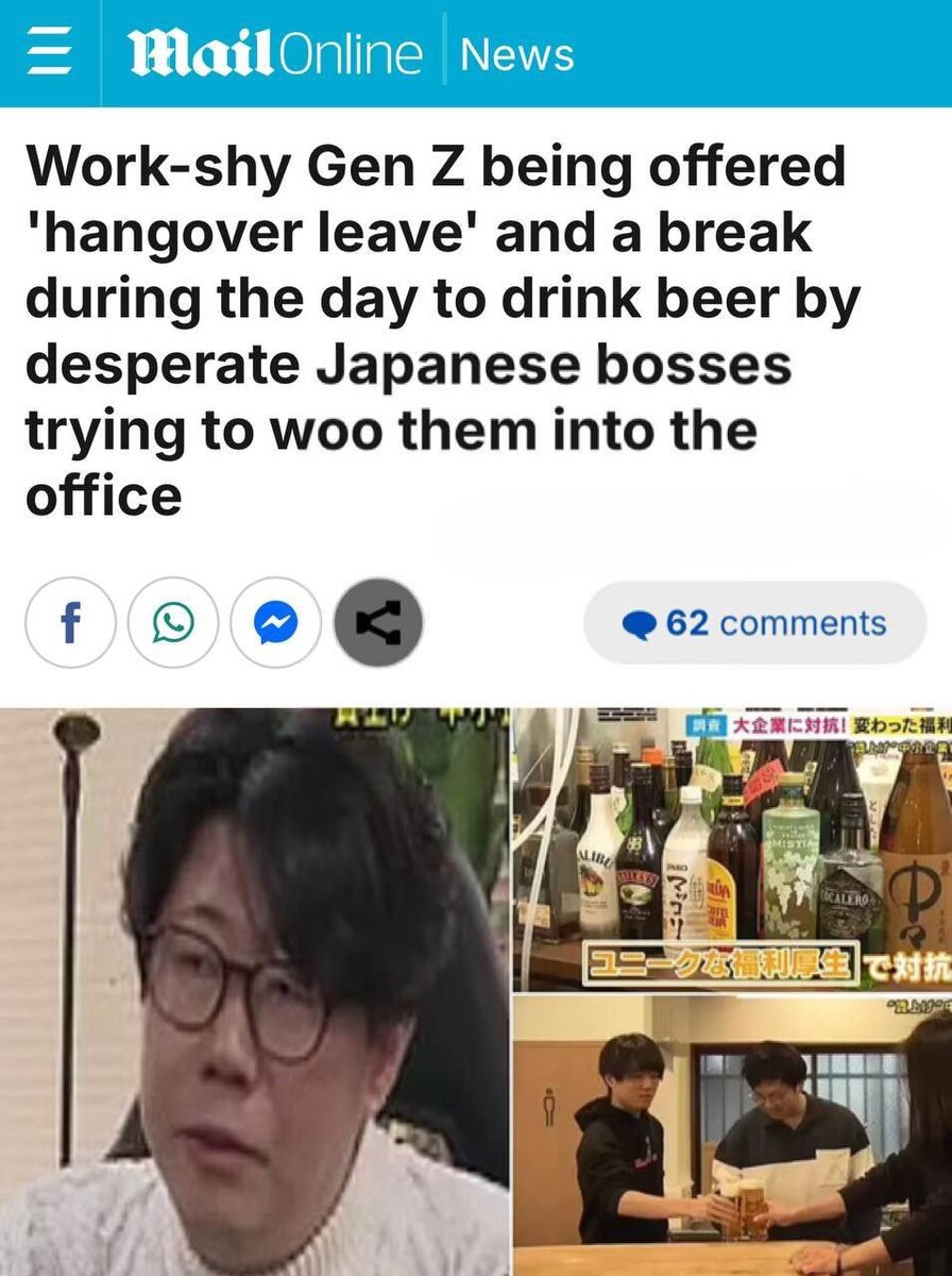 Молодые японцы всё чаще рвутся в крупные корпорации, на этом фоне небольшая IT-компания из Осаки решила выкатить наиболее привлекательный оффер с солидными козырями: • Работяги могут пить пиво и другие алкогольные напитки прямо на работе — боссы считают, что это благоприятно сказывается на атмосфере и улучшает моральный климат в коллективе; • Они могут приходить на работу после 12:00 — отдохнувшие сотрудники будут более продуктивными; • Могут брать «похмельные отпуска» — дополнительный выходной, если прошлой ночью вы перебрали; • В офис никого не загоняют — при необходимости дают возможность работать удалённо и заниматься другими проектами. Руководство отметило, что такие меры действительно помогли им улучшить атмосферу в коллективе и снизить текучку кадров. Работа мечты существует