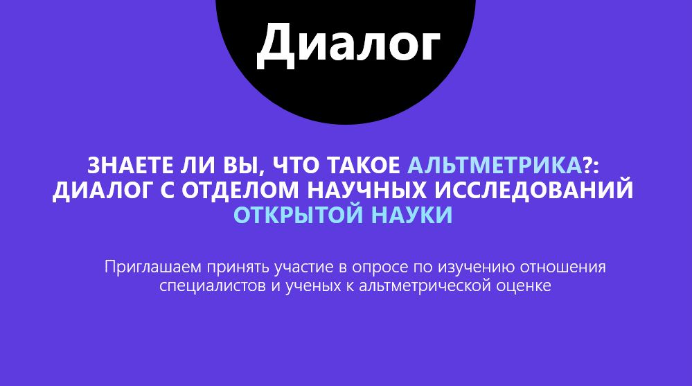 Альтметрика – это альтернативный способ для оценки внимания в сети к научным результатам и их влияния, который имеет определенные преимущества в сравнении с традиционными библиометрическими методами оценки. Важными преимуществами альтметрики являются: оперативность появления альтернативных метрических данных, открытость размещаемых данных, широкий охват источников для сбора данных (новости, блоги, соцсети, мессенджеры ссылок), а также разнообразие альтметрической информации. Тем самым альтметрики позволяют значительно расширить границы коммуникации ученых и способствовать продвижению их научно-исследовательской деятельности в сети. Приглашаем вас к участию в опросе, который проводит ГПНТБ СО РАН. Ваши ответы позволят нам увидеть ваше отношение к альтметрикам и станут основой для разработки рекомендаций по осуществлению оценки результатов исследовательской деятельности с применением альтметрических возможностей. Результаты опроса будут представлены на наших площадках (сайте, Дзен, Телег