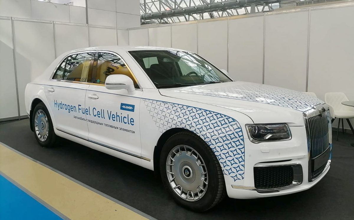 Не забудем и наш российский Aurus H2, разработанный в НАМИ. Внешне он выглядит как бензиновый или гибридный Aurus. Но смотрите: надпись на борту гласит «Hydrogen Fuel Cell Vehicle». Сокращенно FCV. А дальше мелким шрифтом по-русски: «Автомобиль с водородным топливным элементом». Значит, движет это чудо техники не бензин, не дизельное топливо, не природный газ метан, а водород.