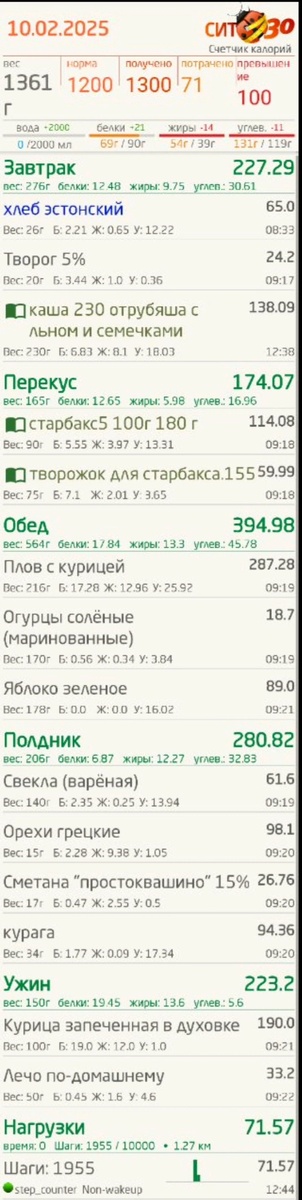 Сегодня проснулась в раздумьях: как питаться? Понедельник, должен быть разгрузочным днем, но у мужа сегодня день рождения. Кто-нибудь приедет на ужин. И поэтому я решила питаться с подсчетом калорий. Без привычки не так-то это быстро получилось. Но результат есть . Уложилась в 1300 калорий. А по БЖУ получился перекос. Надо брать больше белка, тогда и углеводов окажется меньше. Позавтракала кашей-отрубяшей . Вчера разморозила простоквашу и сегодня сделала бутерброды с этой творожной массой и пектиновым вареньем.Летом заморожу больше ягод для пектинового варенья. Очень мне нравится. А на перекус мой любимый старбакс. Он уже занесен в счетчик калорий так же, как и каша отрубяша с льняным маслом и семечками. Только в названии рецепта я указываю количесво в граммах, чтоб не перевешивать и сразу забивать. Так же эстонский хлеб покупаю постоянно и поэтому он у меня тоже забит в рецептах. На обед я взяла плов с курицей. На работе разогрела, спускалась по лестнице и контейнер выскользнул из
