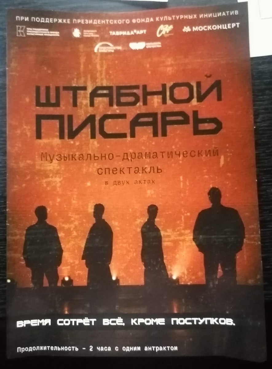9 февраля по приглашению своей младшей дочери побывал на спектакле "Штабной писарь". Постановка была представлена в одном из залов Москонцерта На Каланчёвской улице. Дело в том, что моя дочь участвует в спектакле в составе танцевального коллектива. Что можно сказать о представлении. Это философская притча, сюжет которой родился во время программы "Актуальная драматургия о войне" в рамках проекта "Таврида.Арт". Автором пьесы и режиссёром постановки выступает главный режиссёр Москонцерта Мария Тихонова. Сюжет основан на реальной истории бойца Специальной военной операции Николая Чернобровкина, который присутствовал в зале в качестве почётного гостя. "Штабной писарь" - это не просто спектакль о войне, а рассказ о доблести, поиске смысла жизни и природе человека. Главный герой истории Марк, которого в этот раз играл Денис Стебунов, - путешественник во времени, где его мирная и фронтовая жизнь переплетаются воедино. Однажды он оказывается в бесконечной временной петле и становится