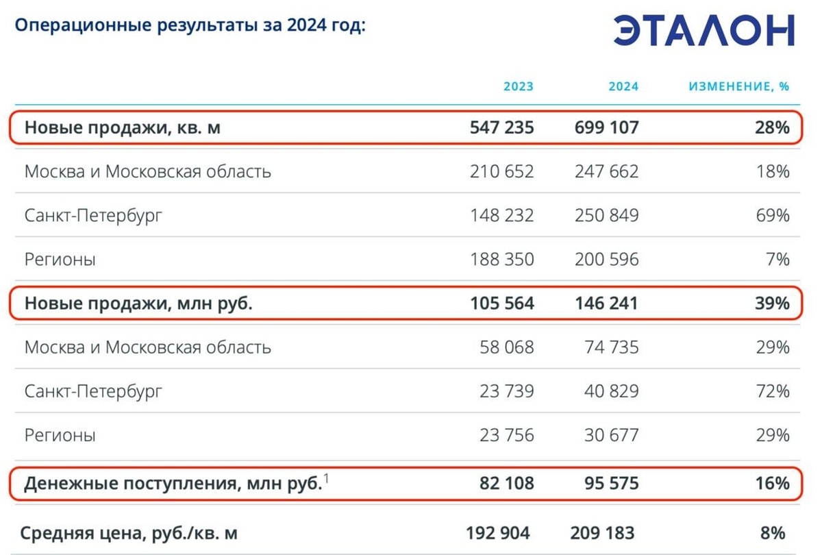 2024 год войдет в историю российского рынка недвижимости, как «время перемен». Полгода панического спроса, пампа цен и нырок во второе полугодие без «льготной ипотеки с господдержкой» для всех граждан. Схемы с рассрочками, аккредитивами, ипотечными стандартами и прочими финансовыми играми прочно вошли в жизнь девелоперов. Первым свой операционный отчет за 2024 год предоставил Эталон, давайте по нему и пробежимся. Итак, новые продажи компании увеличились за год на 28% в метрах до 699 тыс. кв.м. Во втором полугодии темпы роста значительно упали, и два квартала дали всего по 157 тыс. кв.м. В рублях продажи выросли на 39%, но денежные поступления сильно отстали - прирост лишь 16% год к году. Москва за полный год продаж с ее дорогими квартирами, которые перестали пролезать в любую программу, в сухом остатке дала лишь +1% прироста в деньгах, но зато выручки начислили на 29% больше. Компания в Москве работала с бизнес-классом в проектах Voxhall, Shagal, Nagatino I-land. Можно посмотреть на са