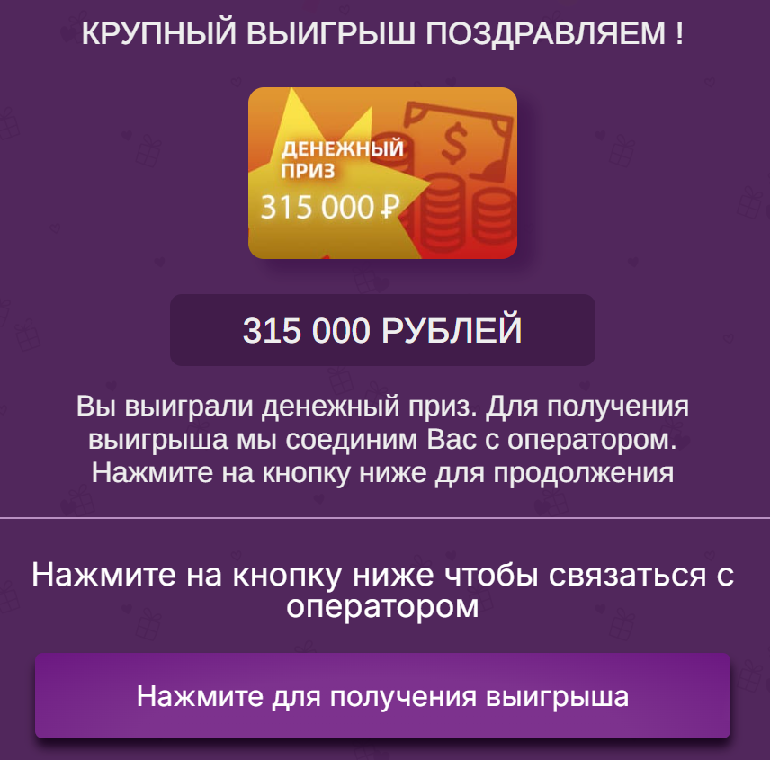 Скриншот страницы в ВК Вчера отметила свой очередной день рождения, а сегодня зашла к себе на страницу в ВК и кроме поздравлений от друзей, увидела в мессенджере одно вчерашнее сообщение вот с таким заманчивым предложением: Скриншот страницы в ВК Конечно, сразу поняла, что это развод. Переходишь по предложенной ссылке и попадаешь в розыгрыш, где имениннику предлагают 3 раза покрутить рулетку. Покрутила ради интереса. Первый приз, который выпал – промокод на 10%-ую скидку в AliExpress, второй приз – подписка на Премьер (PREMIER) всего за 1 рубль, ну а третий, конечно же деньги. У меня выигрыш – 315 тысяч рублей (пишут – «крупный»). Ну а дальше для получения выигрыша нужно нажать на кнопку ниже, чтобы связаться с оператором. Я, конечно, никуда больше нажимать не стала, а почитала сообщения в чате, который находится там же. Сообщения в нём идут через каждые 3-4 секунды: Скриншот страницы в ВК И якобы отзывы от благодарных именинников, уже получивших выигрыш: Скриншот страницы в ВК И всё