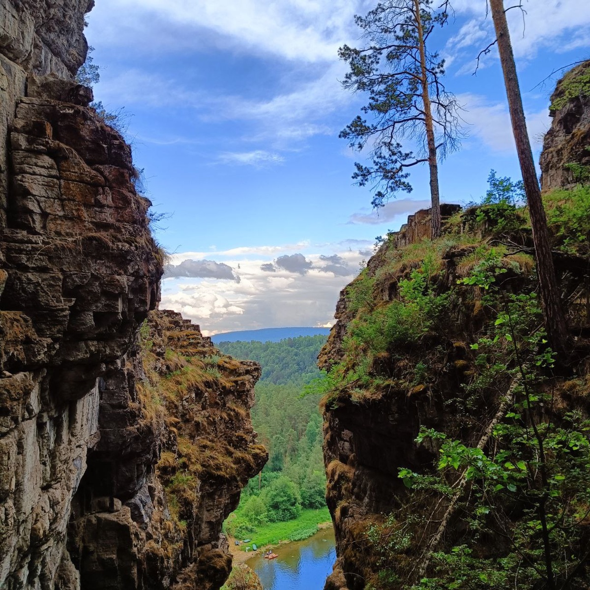 Красота этих мест впечатляет. Самые главные красоты - это скалы - большие и малые притёсы. Наверняка, многие слышали об Айских притёсах. Мы любовались красивыми пейзажами с воды и наслаждались атмосферой красивейшего места Южного Урала. По пути к большим притесам, мы остановились у "сухих" водопадов - это гигантские ступени из камней, и заглянули в таинственный грот пещеры Кургазак.