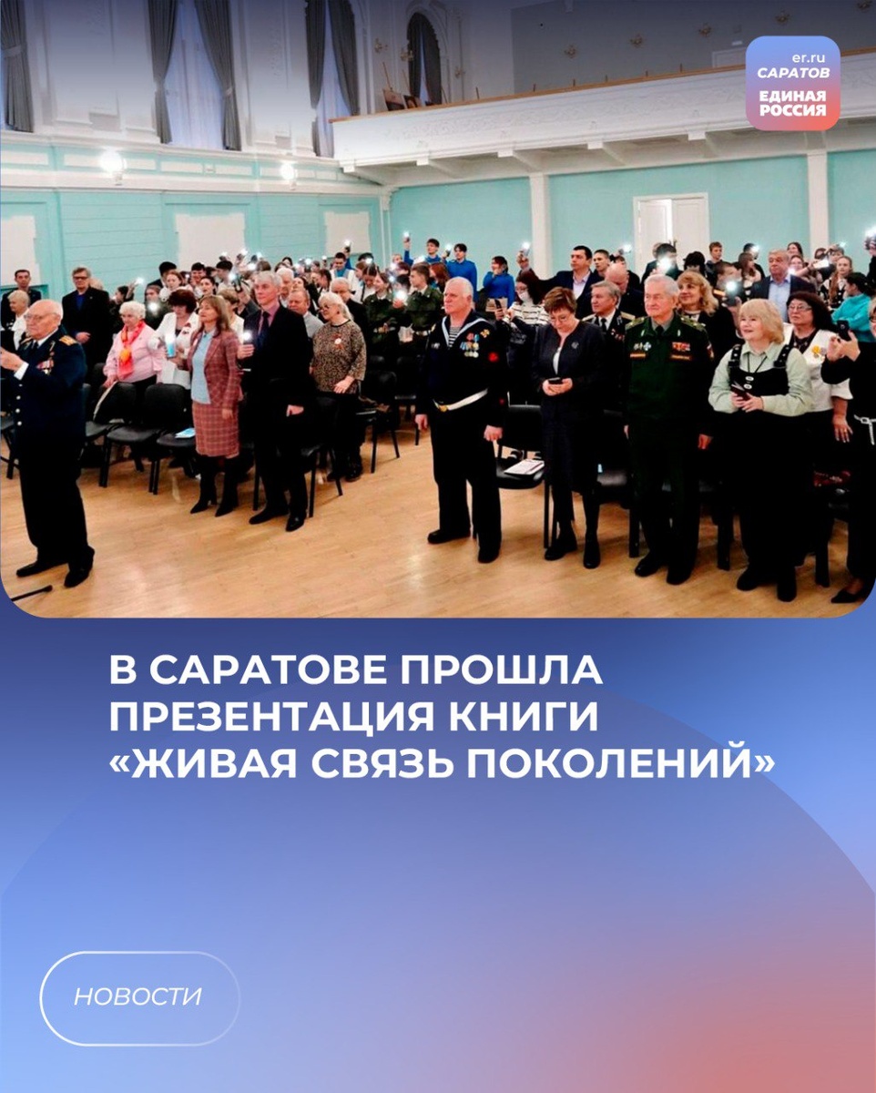 📕Депутат Саратовской городской Думы Ирина Видина приняла участие в торжественной презентации книги «Живая связь поколений», которая состоялось в областной научной библиотеке. Над изданием и редакцией книги работали члены «Российского Союза ветеранов» генерал-майор Юрий Усынин и подполковник Эдуард Казымов. «Живая связь поколений» посвящена 80-летию Великой Победы и специальной военной операции. На мероприятии продемонстрированы документальные фильмы о важных исторических событиях и исполнены патриотические песни. 💬«Формат мероприятия соответствовал названию книги. В зале находились не только представители старшего поколения и ветераны, но и учащиеся школ и лицеев, для которых подобные встречи должны быть напоминаем того, какой ценой завоёвана мирная жизнь», - рассказала региональный координатор проекта «Старшее поколение» партии «Единая Россия» Ирина Видина.