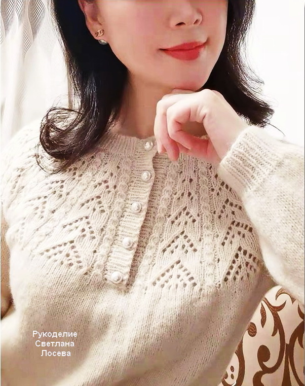 Нежный ажурный узор, словно лёгкое кружево, прекрасно сочетается с гладкой поверхностью лицевой или изнаночной глади, создавая гармоничное и элегантное полотно. Этот контраст добавляет изделию изящества и делает его привлекательным для глаз.
