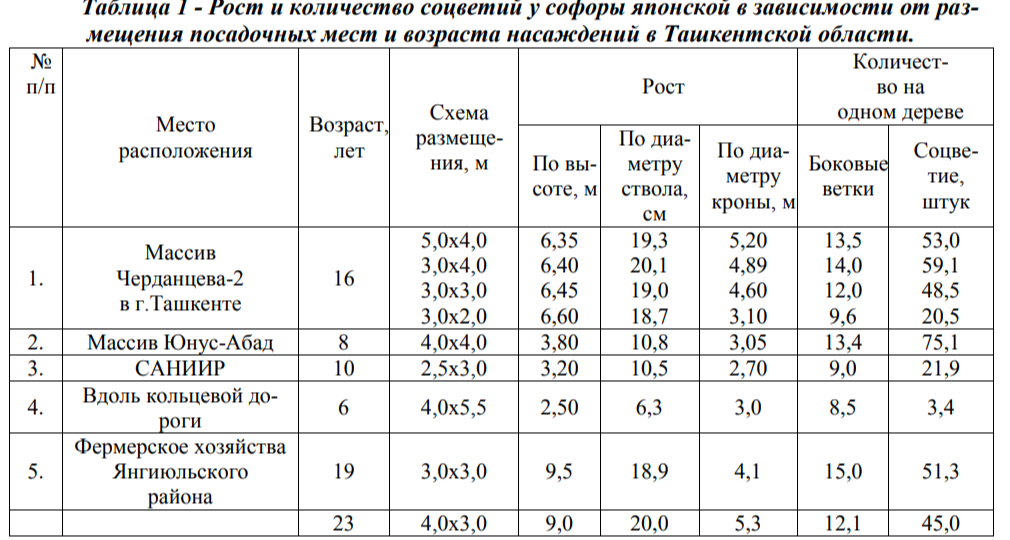 Последующие годы после посадки за насаждениями был проведен уход и заключается он в рыхлении вокруг ствола ранней весной и полива каждую лунку в течении вегетационного периода. В возрасте 4-х лет, были удалены боковые ветки, а затем был и прекращен уход за насаждением софоры. Общее состояние насаждений удовлетворительно, в возрасте 8 лет высота деревьев составляет 3,8 м, 10,8 см. Отдельные деревья, расположенные вдоль улицы суховершинят. Из общего количества 153 деревьев–47 штук относятся к поздно распускающей форме. Листья у них распускаются весной с опозданием на 7-9 дней по сравнению с остальными. Все деревья ежегодно обильно плодоносят, среднее количество боковых плодоносящих веток 13,4 шт, сухой вес бутонов 1500 гр. Пробная площадь–3 заложена вдоль кольцевой дороги, напротив института ирригации САНИИРИ им. В.Л.Журина. Участок длиною 230 м, шириной 60 м состоит из 22 рядов. Здесь в 2002 году софора японская посажена двух летними саженцами в виде рощи между Ташкентской кольцевой дорогой и зданиями института ирригации. Деревья размещены через 3 м между растениями и 2,5 м между рядами. С момента посадки культура софоры поливается по бороздам, однако рыхление вокруг ствола деревьев проведены в первые 2-3 года вручную. Почва под насаждениями сильно уплотнена. Кроны деревьев сомкнуты, некоторые экземпляры (около 7,3 %) суховершинная. В возрасте 10 лет средняя высота деревьев 3,2 м, а количество боковых веток и соцветий очень незначительно. Видимо, объясняется это очень близким размещением рядов через 2,5 м. Плодоэлементы расположены в основном в верхней части кроны. В средней части и особенно в нижних боковых ветках плодоэлементы отсутствуют или встречается в очень незначительном количестве. Пробная площадь–4,заложена в линейных посадках непосредственно вдоль кольцевой дороги в районе Юнус Абадском массиве. Двухрядная полоса расположена на расстоянии 4,5 м от полотна дороги. Крупномерные саженцы софоры высаживались на заранее подготовленные ямы через 5-6 м друг от друга. Расстояние между рядами составляет 4 м из 56 деревьев 18 повреждены при временной стоянки или развороте автотранспорта. Высота деревьев небольшая и в возрасте 6 лет, достигает 2,5 м. кроны деревьев в этом возрасте 3 м, а плодоэлементы встречаются в средней части крона от 4 до 7 шт на одном дереве. Некоторые деревья ещѐ не наступил возраст возмужалости для нормального и регулярного плодоношения. Пробная площадь–5 заложена на территории фермерского хозяйства «Янгиарик» Янгиюлского района в многорядных насаждениях софоры более старшего возраста. На расстоянии от автомобильной дороги 25 м первоначально было посажено несколько рядов софоры весной 1994 года. Последующие годы со стороны хлопковых полей раскорчевано 4 ряда софоры. В момент обследования насаждения занимают около 0,65 га. Общее состояние насаждений хорошее. В возрасте 19 лет высота деревьев составляет 9,5 м, диаметр ствола 18,9 см. При схеме размещения 3х3 м кроны деревьев полностью сомкнулись. Сохранность культур высокая-96,4 % принятии все деревья в насаждении обильно цветут и плодоносят. В течении четырех лет за культурами проводилось рыхление почвы и регулярный полив по бороздам. Поскольку посадочных места были размещены в шахматном порядке культивация почвы проводилась вдоль и поперѐк ряда, то есть между рядами и между растениям