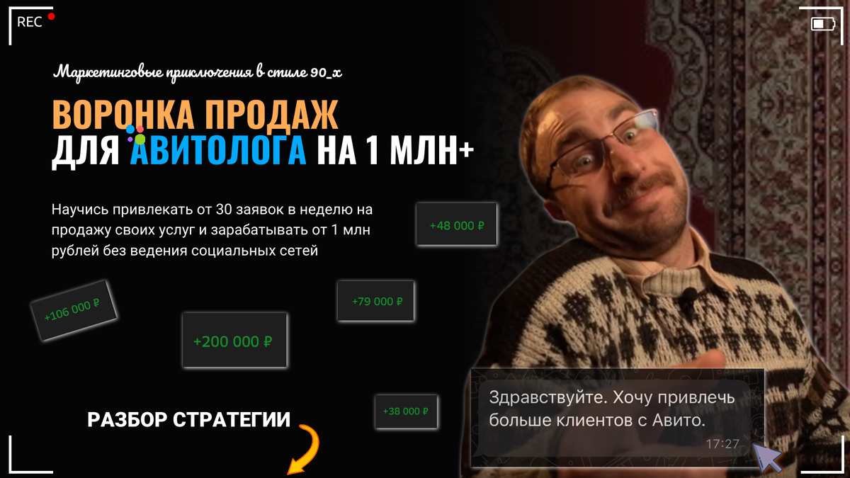 В обычном подходе работы: чтобы Авитологу заработать 1 млн+ ему нужно взять 25 клиентов по 40 000 руб. Настроить поток заявок, научиться продавать с конверсией 40% или второй вариант - пересмотреть свою стратегию в работе. На примере собственного опыта и фактов, я расскажу как Авитологу получить до 30 заявок в неделю, заработать 1,2 млн рублей за 3 месяца на продаже своих услуг и продуктов, без ведения социальных сетей. Вы, вероятно, читаете эту статью, потому что ваши текущие методы привлечения клиентов больше не приносят желаемых результатов или работают нестабильно. Или вы ищите новый способ, как заработать денег на оказании своих услуг. 🔋 В один месяц вам удаётся заключить 2-3 сделки с новыми клиентами или пролонгировать старые договоренности. 🪫 В другой месяц — вы сидите без клиентов и не понимаете где их взять. Вместо ясной стратегии — полная неразбериха, и не понятно что делать в таком случае. Либо начать вести социальные сети, но давайте признаемся честно друг другу "До них н