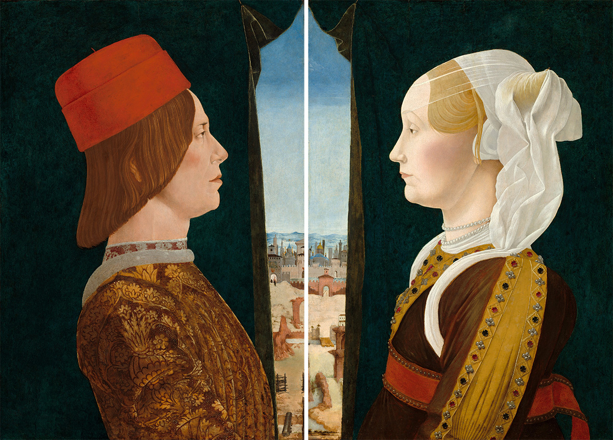 Приобретенная из коллекции Дрейфуса в Париже дилером Дювеном и проданная Сэмюэлю Х. Крессу в 1936 году, эта пара портретов, изображающих Джованни II Бентивольо и его жену Джиневру Сфорца, ранее приписывалась Франческо дель Косса (1436–1478). Однако сегодня принято считать, что Эрколе Роберти (1455/56–1496) написал портреты в середине 1470-х годов, когда он всё ещё находился под влиянием своего бывшего учителя, а моделям было около тридцати лет. Портреты соответствуют традиции представления правителей и их семей, с акцентом на черты лица и изысканную одежду модели. Также следует традициям изображения жен и дочерей правителей, бледный цвет лица Джиневры, контрастирующий с более румяными оттенками, использованными для её мужа. Хотя портреты четы Бентивольо были написаны порознь, изначально они, должно быть, составляли диптих, вдохновленный работой Пьеро делла Франческа (1415–1492), на которой можно увидеть Федерико да Монтефельтро и его жену Баттисту Сфорца. Биографии моделей указывают