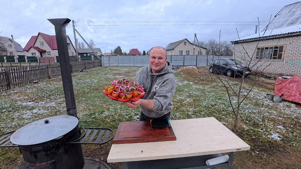 Убираем старое растительное масло из казана, заливаем новое 50 грамм и выкладываем на дно казана картофель, сверху картофеля выкладываем мясо, добавляем 300 гр воды и закрываем крышкой минут на 60мин! На этом этапе нам не нужен огонь в очаге, весь процесс происходит на углях, поэтому мы перекрываем заслонку, тем самым минимизируем подачу воздуха в очаг, крупные не сгоревшие дрова лучше вообще убрать. Максимум через 60 минут блюдо готово, определить это лучше всего по степени готовности картофеля.