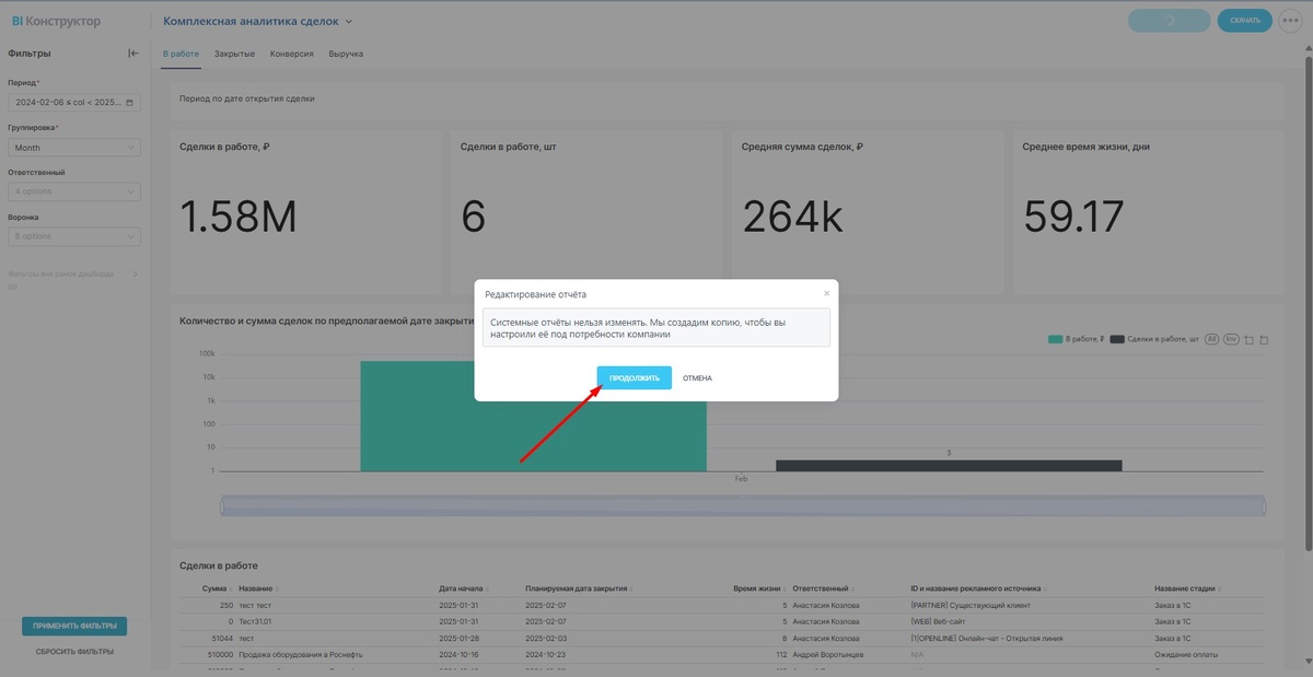 Рады представить вам еще одну статью из нашей серии про BI-конструктор! Сегодня мы расскажем вам, как изменить типовой отчет, который предлагает нам Битрикс24. Предположим, что в типовом отчете много лишней ненужной вам информации, или, например, вам хочется соединить графики из двух отчетов в один – как это сделать читайте ниже :) Как заходить в раздел с BI-конструктором и отличать типовые отчеты, мы с вами научились в предыдущей статье. Рассмотрим редактирование наполнения дашборда на примере отчета «Комплексная аналитика сделок». Для этого откроем данный отчет и нажмем на кнопку «Редактировать». Система сообщит нам, что системные отчеты нельзя изменять и предложит создать копию отчета, нажимаем «Продолжить»: Далее нажмем «Редактировать дашборд» и нам откроется режим редактирование. Здесь мы нажмем на название, чтобы изменить его, а также посмотрим, что находится на вкладках: Уберем с вкладки «В работе» график «Количество и сумма сделок по предполагаемой дате закрытия» нажав на корзи
