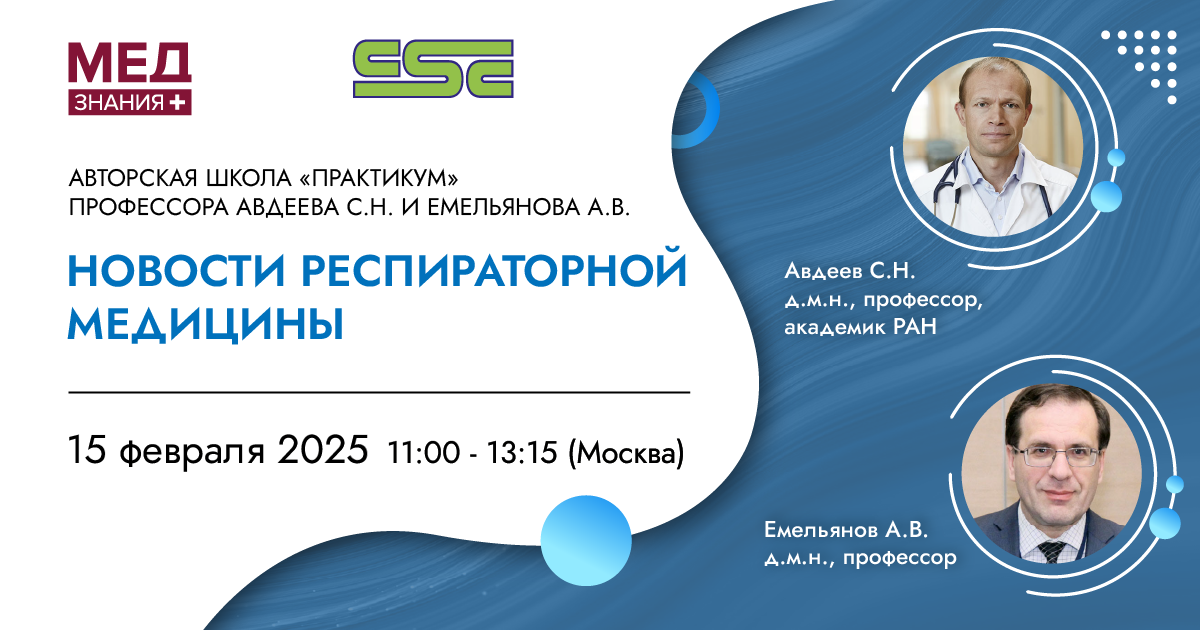 15 февраля 2025 г. в 11:00 состоится Авторская школа «Практикум: «Новости респираторной медицины» профессора Авдеева С.Н. и Емельянова А.В. Научные руководители: Авдеев Сергей Николаевич – д.м.н. профессор, академик РАН, заведующий кафедрой пульмонологии ФГБОУ ВО Первый МГМУ им. И.М. Сеченова Минздрава России, главный пульмонолог МЗ России, Москва. Емельянов Александр Викторович – д.м.н., профессор, заведующий кафедрой пульмонологии ФГБОУ ВО «Северо-Западный государственный медицинский университет им. И. И. Мечникова» Минздрава России. Респираторные заболевания, такие как бронхиальная астма и инфекции дыхательных путей, остаются серьезной клинической проблемой, требующей глубокого понимания современных тенденций и новых научных данных. 2024 год принес новые открытия, которые способствуют более эффективному лечению и контролю заболеваний, влияющих на качество жизни миллионов пациентов. В ходе школы врачи смогут расширить свои знания о ключевых темах, обсудить сложные клинические случаи