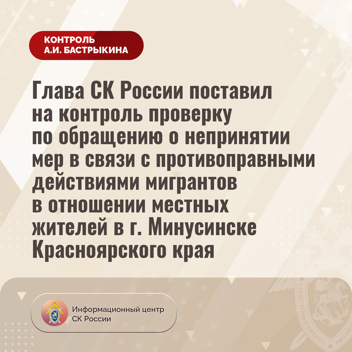 Глава СК России поставил на контроль проверку по обращению о непринятии мер в связи с противоправными действиями мигрантов в отношении местных жителей в г. Минусинске Красноярского края В Информационный центр СК России обратилась жительница Красноярского края по вопросу совершения мигрантами противоправных действий в отношении ее родственников в поселке Зеленый Бор города Минусинска. В феврале текущего года в ответ на замечание о недопустимости нарушения правил дорожного движения четверо фигурантов жестоко избили брата и племянника заявительницы, причинив им многочисленные ушибы, гематомы и переломы. Пострадавшим потребовалась медицинская помощь. Несмотря на наличие видеозаписи, на которой зафиксирован факт избиения, органами внутренних дел виновные к ответственности не привлечены. В ГСУ СК России по Красноярскому краю и Республике Хакасии по поступившему обращению начата процессуальная проверка в отношении сотрудников органов внутренних дел. Председатель Следственного комитета Российс
