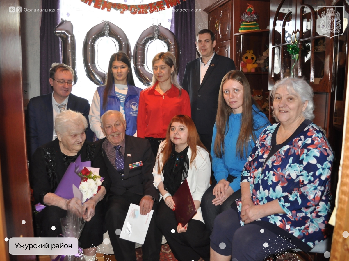 От имени Президента Владимира Путина и губернатора Михаила Котюкова с юбилеем ветерана поздравили представители районной администрации, Совета ветеранов и молодежного центра, участники движения «Волонтеры Победы».