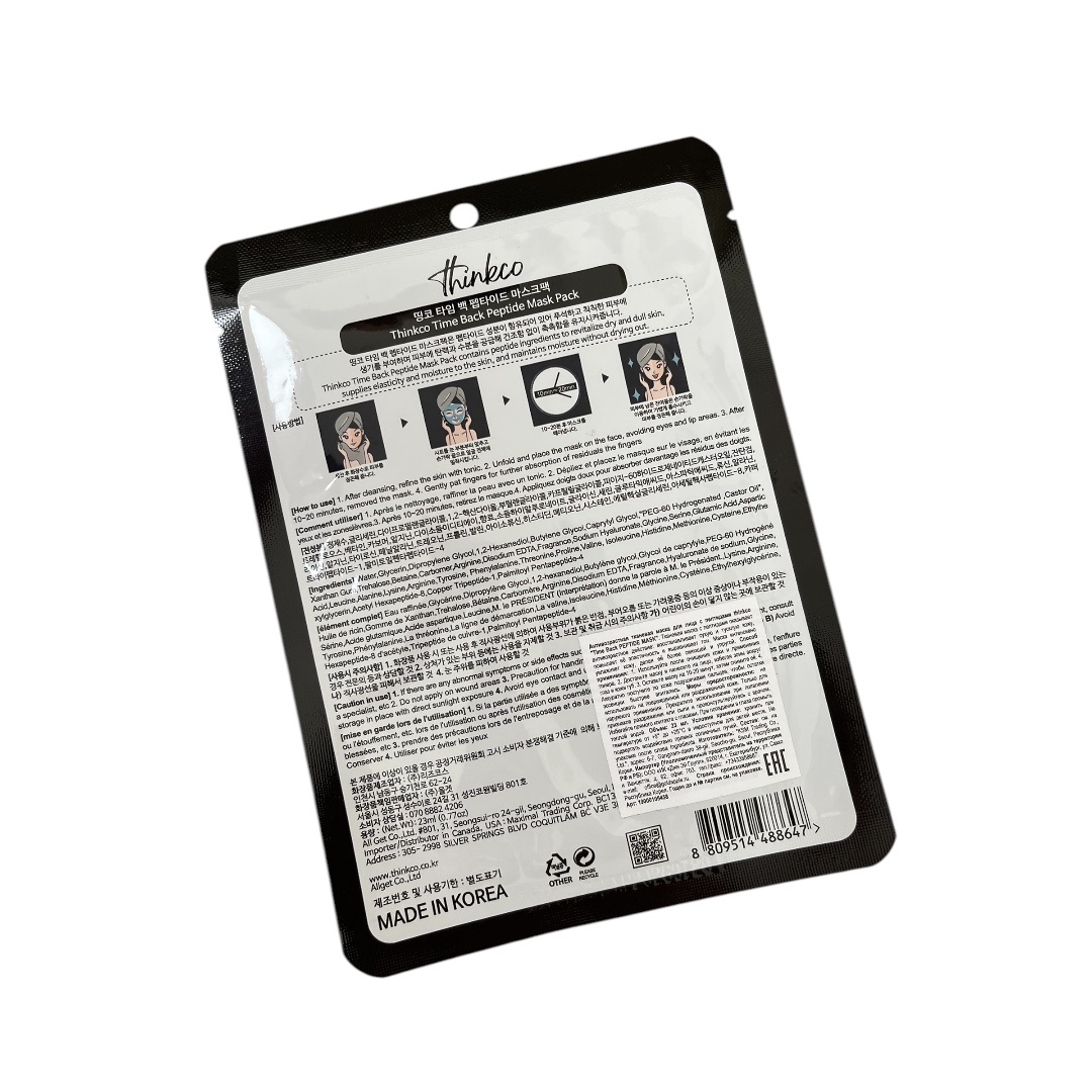 Последняя и самая популярная по всей видимости антивозрастная тканевая маска для лица от Thinkco с пептидами Time Back Peptide Mask на обзоре. Упаковка-все стандартно, сашетка с засечками для вскрытия, глянцевая, вся информация на обратной стороне, внутри маска, объем 23 мл. Про лекала я уже писала, они несуразные и из очень дешевой ткани. И у меня один вопросик к производителю-в лекале есть дополнительные кусочки ткани для глаз и многие, судя по отзывам, накрывают ими глаза, а в инструкции написано наносить маску, избегая области вокруг глаз и губ, это как? Наношу на чистое лицо (предварительно достав из холодильника) и лежу минут 15 с ней, снимаю почти сухой. Неприятных ощущений нет. Запах не яркий, но дешевенький. После снятия кожа увлажнилась, липкости нет, но и эффекта вау тоже. Состав 🤮, аллергикам и людям с чувствительной кожей мимо. Вывод: однозначно из всех тканевых масок, которые я пробовала от Thincko, эта и с коллагеном мне понравились больше всего, но повторять и рек