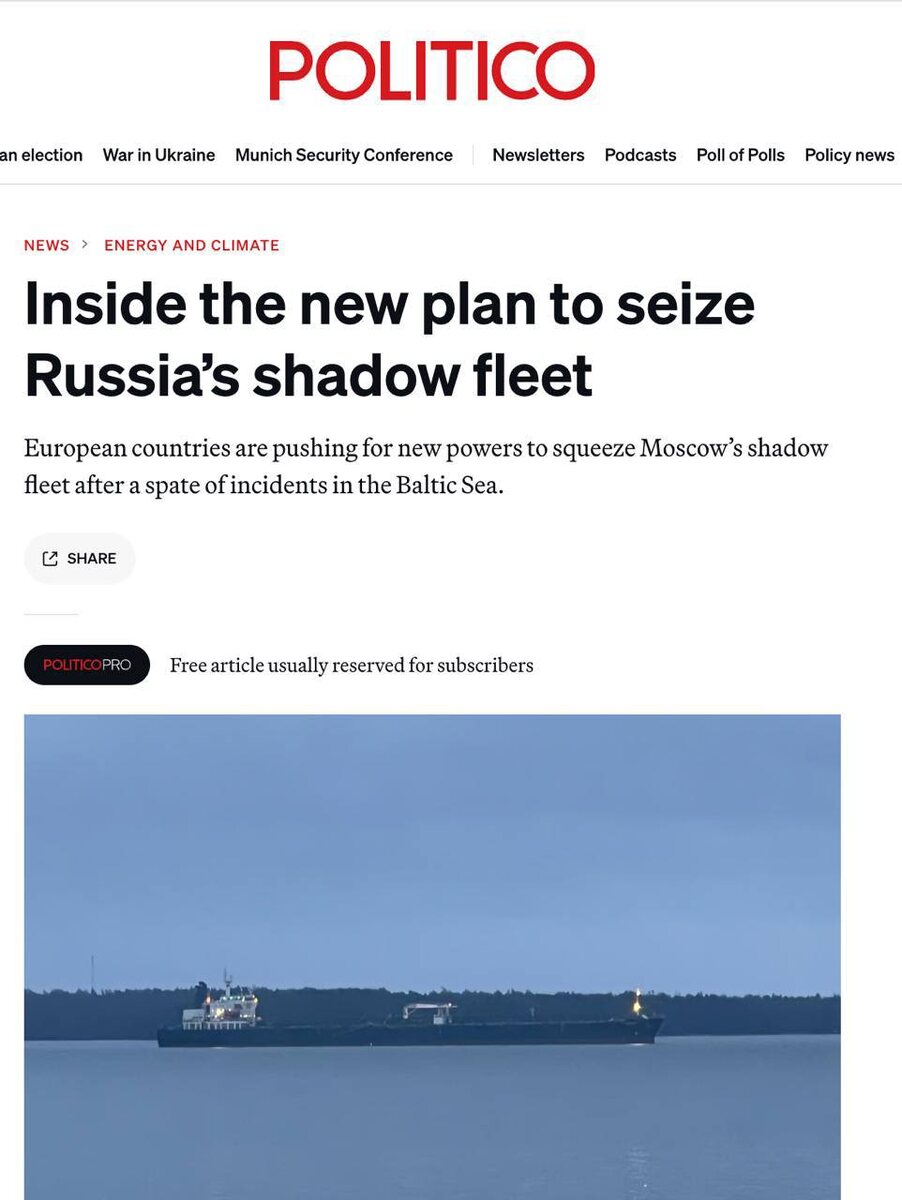 ЕС готовится к масштабной операции по захвату связанных с РФ танкеров на Балтике — Politico Новое законодательство позволит захватить судно за ущерб, который оно якобы может нанести окружающей среде, и за якобы совершенное повреждение подводных кабелей и другой критически важной инфраструктуры в море. Захваты судов. Представляете? Похоже на провокацию, так это она и есть. Инициаторы - опять самые мощные страны ЕС - Литва, Латвия, Эстония. Придумали бы спецоперацию по отмене «терминов» к врачам, чтобы люди осмотра не ждали по полгода. Но то такое. Важно суда захватывать. А если РФ все же отреагирует и начнет их защищать? НАТО будет военные действия проводить?