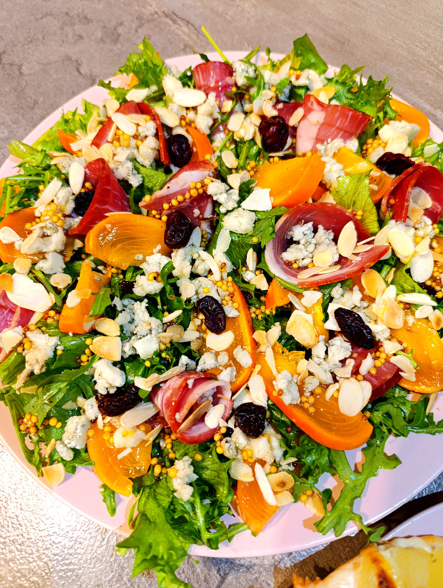 Яркий салат с хурмой, вяленой вишней, острым сыром и копчёной шейкой. Интересная заправка на мандариновом соке.