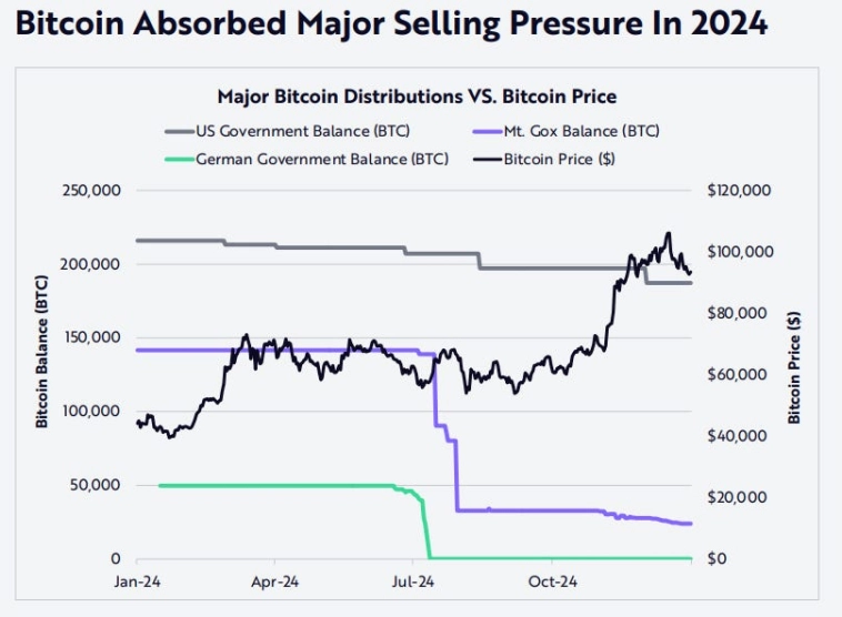В январе 2024 года немецкое правительство конфисковало 50 000 биткойнов, связанных с группой пиратов. Через полгода биткойны были проданы, при этом рынок успешно поглотил предложение, после чего цена биткойна выросла с $53 000 до $68 000. Также в середине года завершился долгожданный процесс выплат кредиторам Mt. Gox, в ходе которого было распределено более 109 000 биткойнов.
