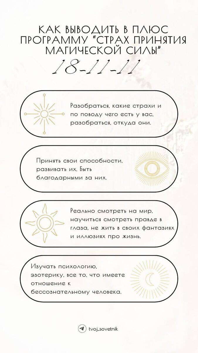 🗝️ Ключ к успеху: раскрытие своего потенциала. 🪨 Камень, который тянет вниз: непринятие своих способностей. Сильная сторона программы (плюс): Сильнейший потенциал, умение его раскрывать и применять на деле. Возможность добиться успеха в любой сфере. Обладание магическими способностями. Слабая сторона программы (минус): Страх принять и понять свой потенциал, страх предпринимать реальные действия для раскрытия потенциала. Постоянно сдерживать себя от реализации.