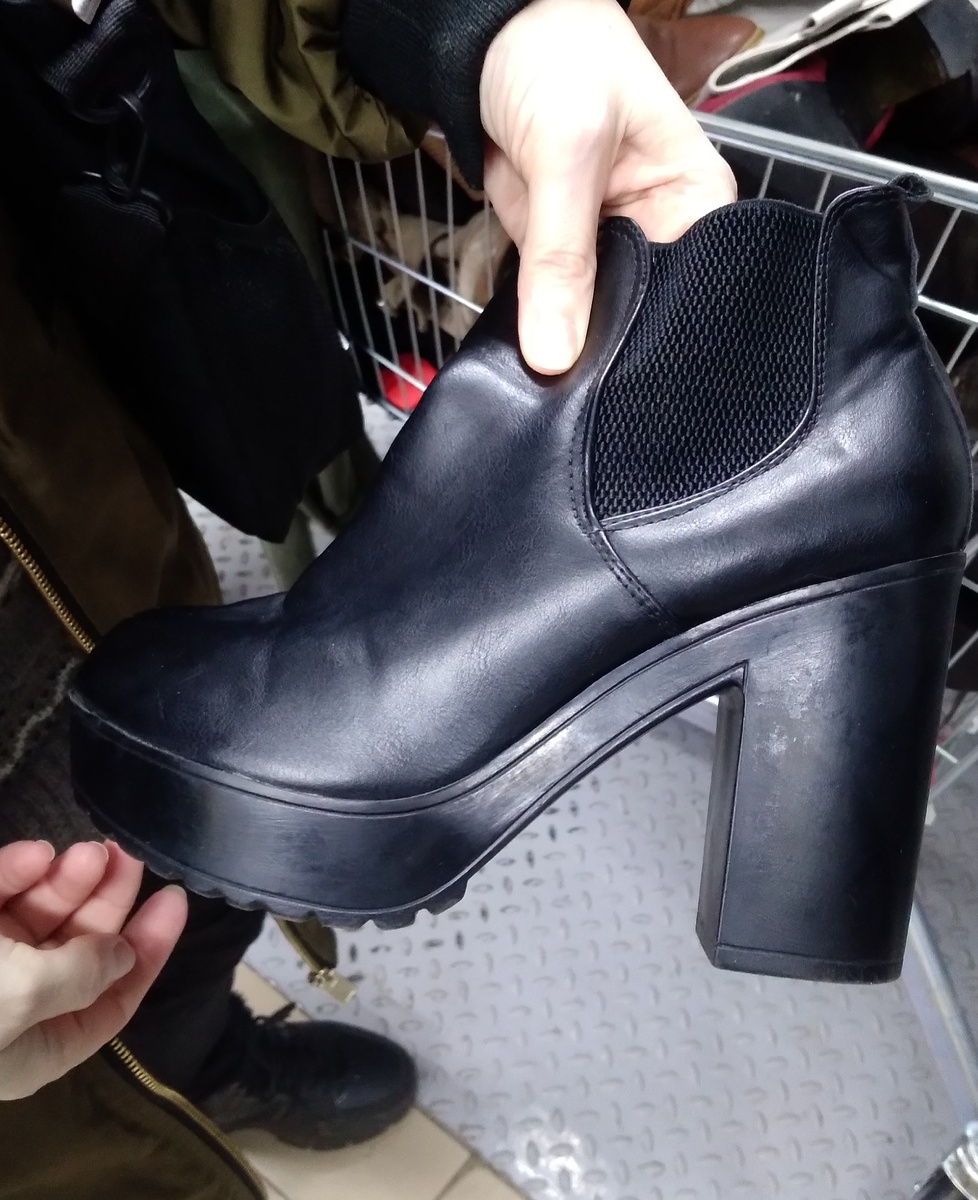 Здравствуйте, сегодня обувь по 50 рублей. Были полностью заполненные две тележки, но когда я к ним пробилась все уже уполовинилось)). Счастливчики тащили корзинки наполненные обувью. Возможно люди набирают на всю семью, друзей и знакомых или к размерам особо не придираются. Чёрные ботильоны с резинкой сбоку. Толстая подошва, толстый устойчивый каблук, не всем эта модель удобна и вообще не всем нужна. А вот берцы удобная обувь, нынче хоть под джинсы надевай, хоть под юбку. Кожа с маленькими чешуйками под черную змею. Демисезонные сапоги с высоким голенищем и толстой подошвой. А над подошвой резиновый кант, то есть можно топать по лужам, шов защищён. Короткие демисезонные сапожки на шнуровке. Даже не поняла искусственная замша или нет. Высокие ботинки с трещинами, вот только сейчас обратила внимание. А выглядят неубиваемыми, одних швов сколько. Зимние сапоги с парой ремешков для красоты, сверху вроде трикотажной манжеты, видимо имитирует надетые длинные носки. Ещё одни берцы, но светлые