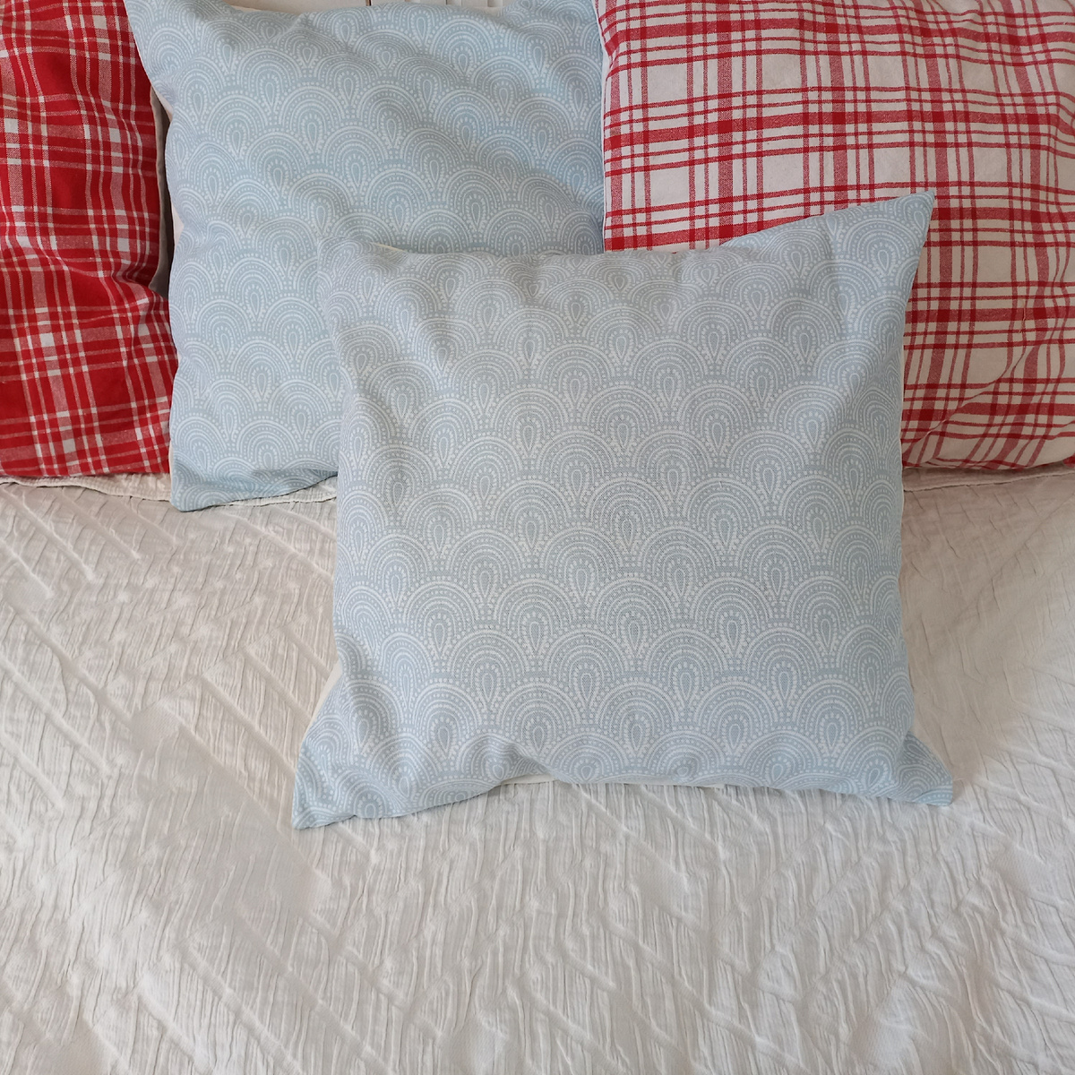 В магазине я купила два голубых полотенца для кухни, за 100 рублей каждое. Они у меня лежали и ждали своего часа. Но принт и цвет мне настолько нравились, что я решила не использовать полотенца по прямому назначению, а сделать из них декоративные наволочки. Чтобы сделать такие же, только из своих полотенец, вам понадобится: