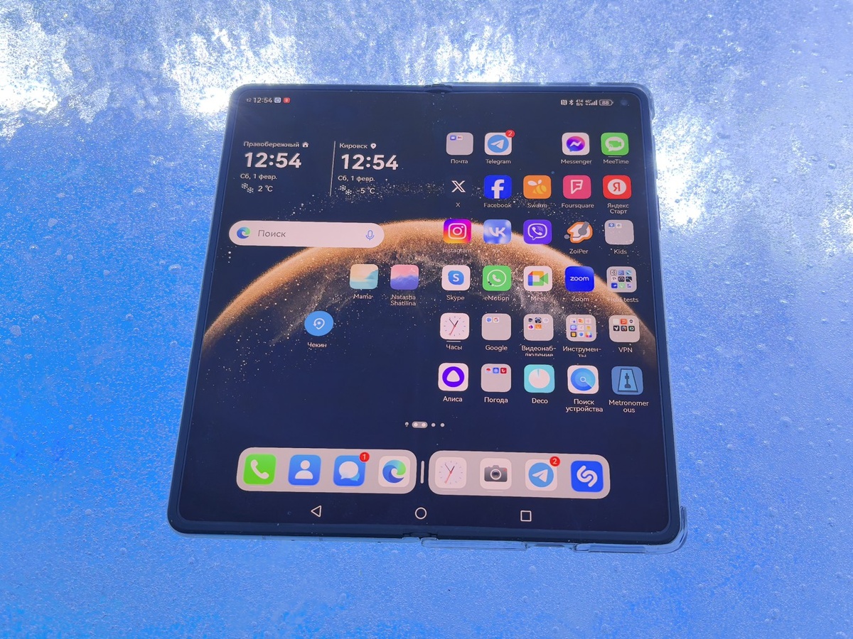 И по качеству съёмки Mate X6 точно даст фору многим: по сути, система камер тут почти такая же, как в Pura 70 Pro: основной модуль с изменяемой диафрагмой (f1.4-f.4.0), зум и «ширик», все на RYYB-сенсорах, которые воспринимают больше света. Хотя есть нюансы: зум 4-кратный и менее светосильный, зато «ширик» 40-мегапиксельный и с углом обзора 120 градусов. Главная же «фишка» X6 – это гиперспектральный датчик, задача которого – максимально точно фиксировать цвета в кадре. Его данные используются для постобработки, поэтому у вас всегда получается идеальный баланс белого, естественный тон кожи, зелёная трава и так далее: цвета невозможно исказить освещением и т.п. Например, я фотографировал в Кировске замёрзший фонтан, на который все едут посмотреть потому, что лёд здесь голубого цвета. Так вот, при съёмке на другие смартфоны (а мы доехали до места на снегоходах уже к вечеру) глыба получалась белой, серой – какой угодно, только не голубой. И только на X6 цвет был передан корректно.