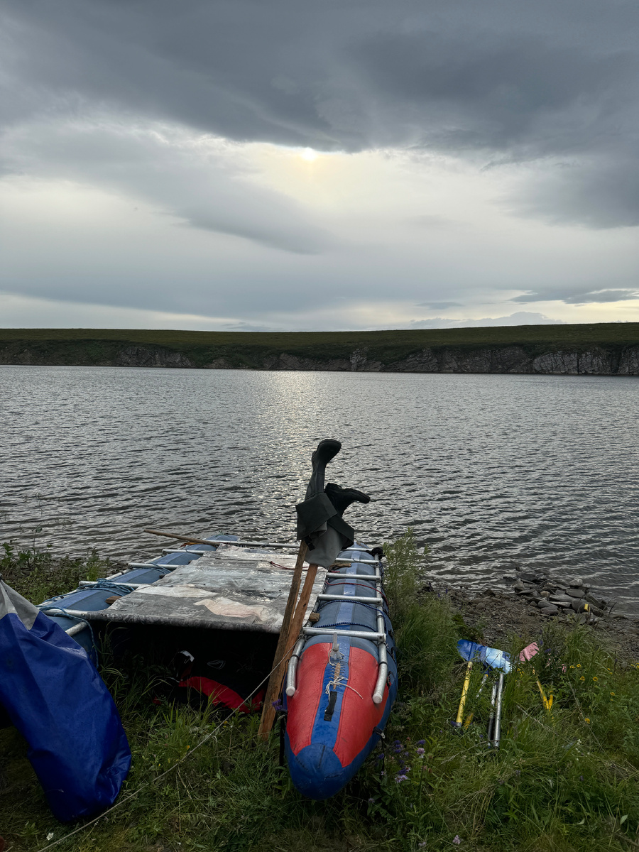 4 августа, река Уса, выход с маршрута Утром встала очень рано. Вылезла из палатки, и наконец то реально почувствовала холодное дыхание севера. Все небо заволокло недружественными тучами, но что нам погода, ведь у нас сегодня праздник – у нашей Юли День Рождения. Так получается, что уже много лет празднование ее днюхи проходит в походах. Юле тоже сегодня с утра не спалось, и мы с ней решили для начала привести себя в божеский вид. Вид у нас с утра был еще тот, и мы смеялись друг над другом так , что перебудили весь лагерь. Но волшебные маски, вкупе с волшебными напитками сделали свое дело прекрасно, и уже через полчаса Юля предстала для ее поздравления красивая и нарядная. Пока мы поздравлялись, собирали лагерь и готовились к последнему рывку для выхода с маршрута, а оставалось нам до завершения его водной части всего каких-то 5-6 километров, задул крепкий боковой ветер. Уже на сильном ветру мы погрузились в каты, и всем пришлось знатно поработать веслами. Первый километр нас еще нем