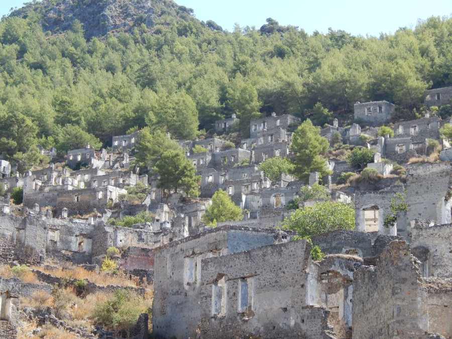 Эту долинку в 9 километрях от Фетхие люди освоили ещё в античные времена. Город на склонах гор назвали Кармилассос. Шли столетия, менались имена и к началу XX века над долиной стоял городок Левисси, населённый греками. Но потом, после катастрофы греческой Megali idea, начался обмен населением: анатолийских греков отправляли в материковую Грецию, турок из Греции депортировали в Турцию. Количество вновь прибывших турок было относительно невелико и город оказался брошенным. В 1923 году греки ушли, а турки только поменяли название на "более правильное". И теперь четыре тысячи домов без крыш глядят вниз, на долину, пустыми глазницами окон. Сами не живём, но полотнище с полумесяцем будет гордо реять, ага. Паутина на солнце С самой высокой точки города, от часовни, видно море Неподалёку видны развалины башни Вид от часовни на город Когда бродишь по пустым улочкам, веселье быстро исчезает Сухой чертополох очень колючий. И пытается цвести несмотря ни на что. Город покинут почти 90 лет, но на не