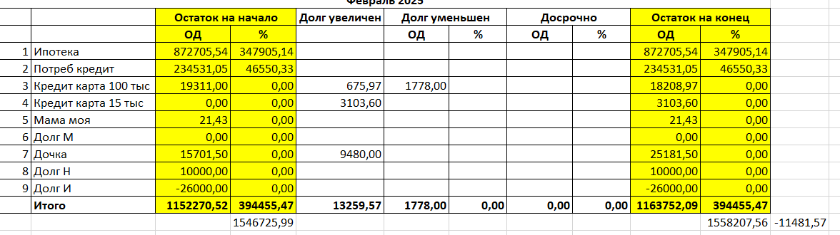 - Дочка. Долг 25181,5 руб.. Здесь уже по серьезнее, долг реальный)) Дочке мы постоянно что-то должны))) У нас репетиторы, целых 3 штуки. Она часто платит сама за них, сумма копится. Я учитываю у себя, что и когда она платила. Это долг за 2 месяца, в том числе за февраль. Она зарабатывает, деньги небольшие. И многие мелкие расходы она делает со своих денег. Долга не было бы, но в январе-феврале мы ей давали много денег, так как она была дней десять в Питере и еще две недели в Москве. Часть оплачивала сама она, часть мы и конечно парень помогал. Долго рассказывать, но потратились много, все))) Долг буду сокращать потихоньку. Но в марте он опять увеличится.