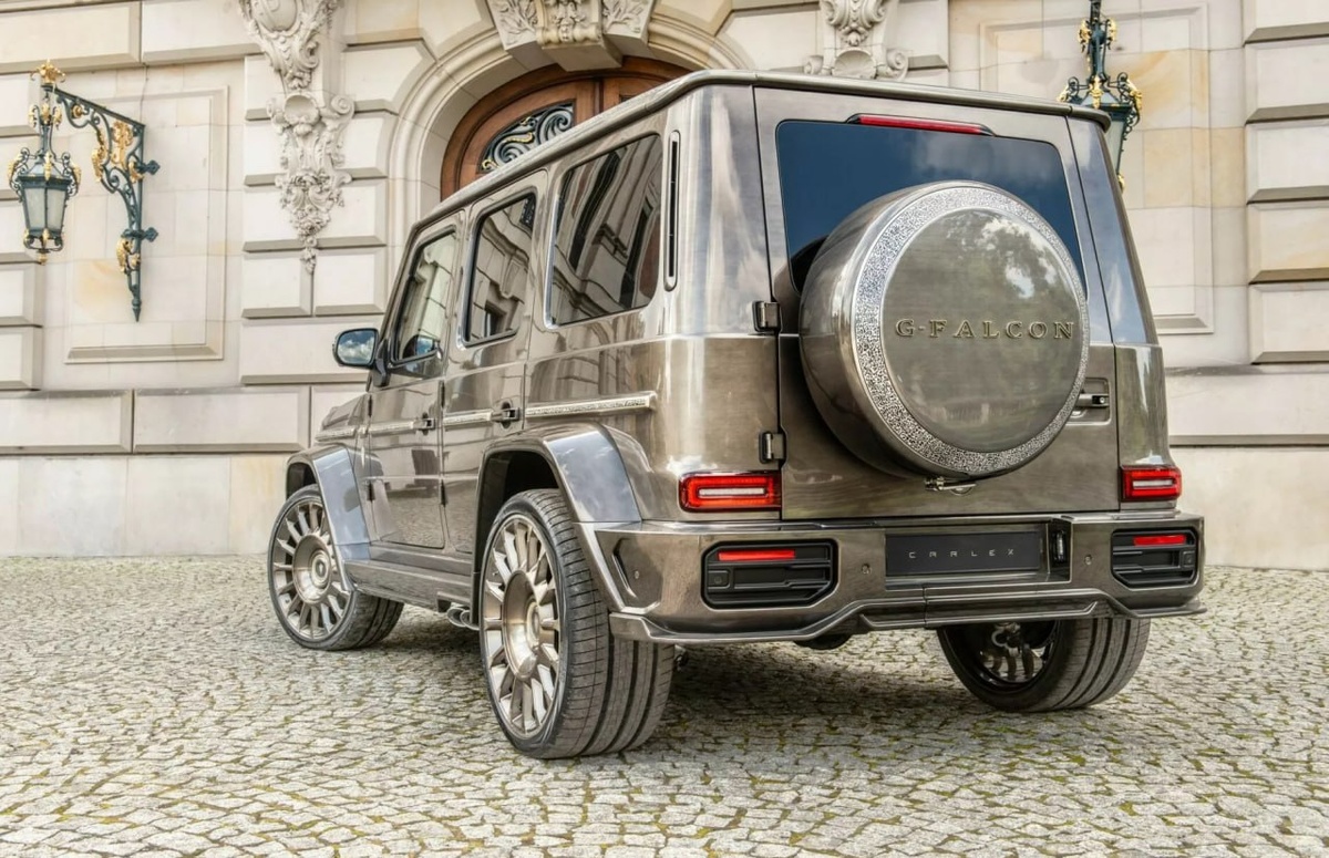 Главная особенность внедорожников от Carlex Design — это фреска ручной работы на крыше. Крыша G-Falcon — это изюминка. Один из опытных мастеров Carlex вручную вырезал и нарисовал детальную фреску с изображением сокола. Салон не менее особенный, в нем преобладает темно-бордовая кожа с черной алькантарой и замысловатыми вырезами на центральной консоли и дверных панелях. На создание уникального автомобиля уходит около 18 месяцев.