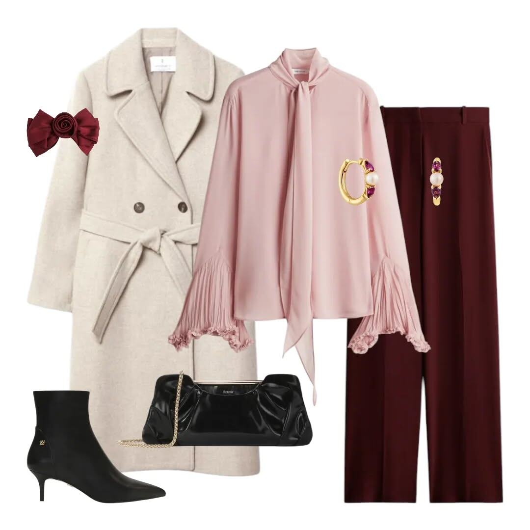 Все оттенки розового выгодно освежают внешность. Посмотрите, как здорово пудровая блузка сочетается с бордовыми брюками и светлым пальто. Ботильоны перекликаются по цвету с сумочкой.