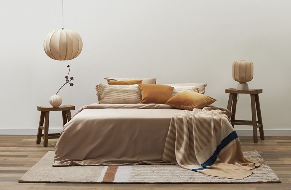 - Пледы, покрывала и постельное белье. Например, стильные предметы из коллекций Tkano, выполненные в благородных теплых тонах.