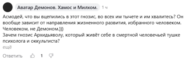 Всё бы было ничего.. но если б не эти фразы, то я б не поднял данной темы, да и не назвал это анекдотом. Найти этот канал в Дзене не составит труда, ибо его название уже есть в комментарии. Но вот именно эти слова перечеркивают всю информацию, которую несет сам автор, говоря о завоевании демонами человеческой души и одержании его тела. Гнозис нужен человеку, а не Демону... Это уже интересно. Ибо человек есть форма природы, которую обретает демон при воплощении в любом Мире. Он, раскрывая глубины сознания в обитаемой среде, являет себя как истину и захватывает пространство в своем могуществе, демонстрируя тем самым масштабы величия. А на чем как вы думаете это всё держится? Правильно.. На гнозисе.. Если у Демона (Дух как Сила) нет гнозиса, то и определение у него отсутствует. Ибо Имя, что дано ему при рождении (появлении в среде), является сущностью его гнозиса. То есть определением сути и явления. И еще... Демоны, Бесы, Боги, Духи, Ангелы и прочие имена Духов являются по сути своей ч