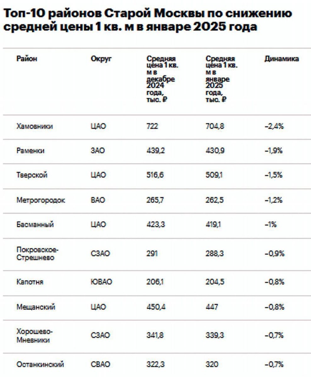 По информации от РБК Недвижимость, наибольшее снижение цен на вторичное жильё в январе 2025 года было зафиксировано в районах Хамовники, Раменки и Тверской.