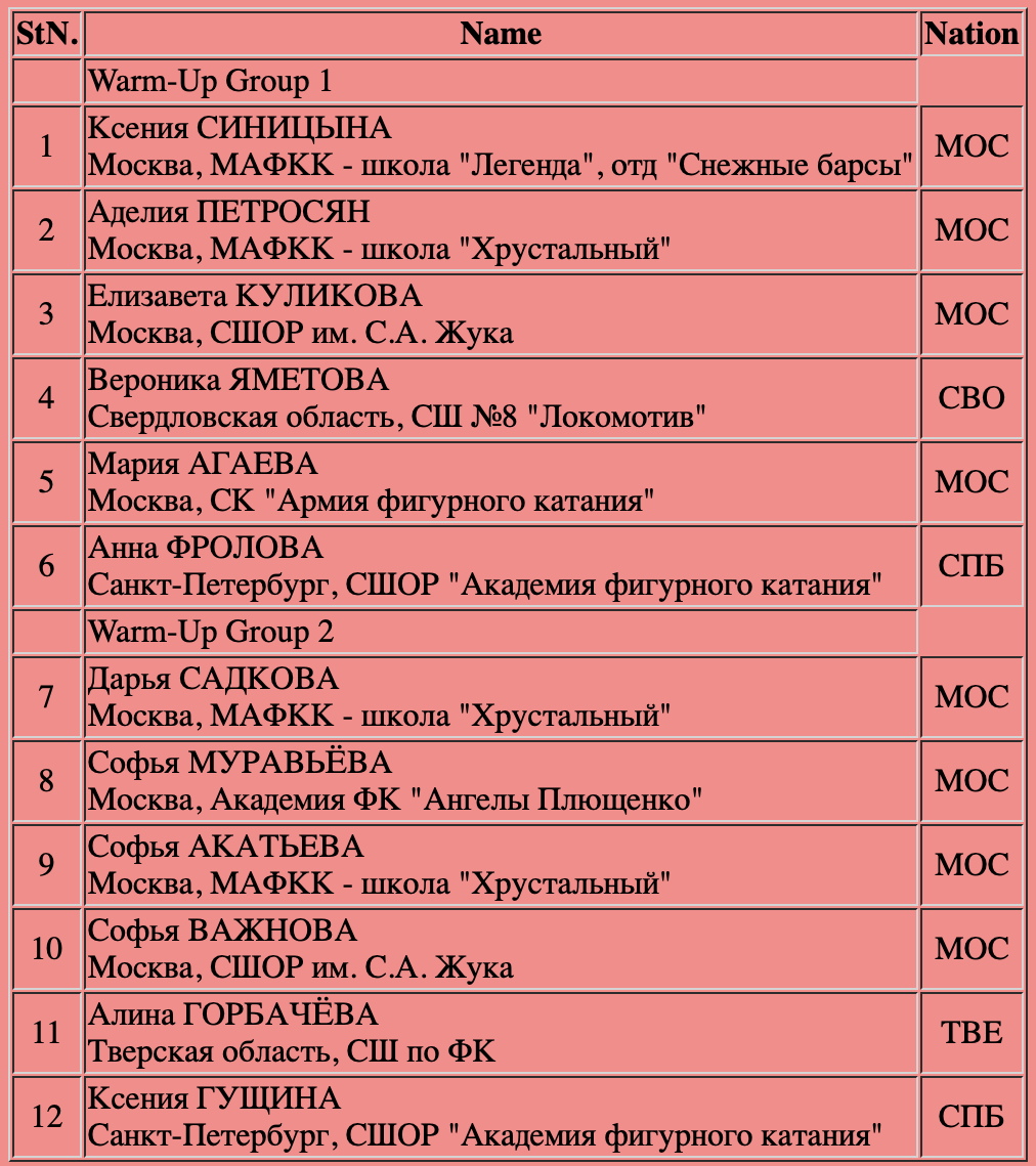 Список участниц и порядок выхода на лёд: