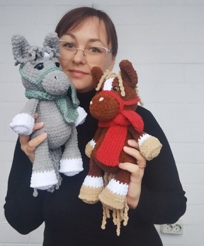 Здравствуйте дорогие друзья! Следующий год - год Лошади. И хоть я и не планировала выпускать МК так рано, но звезды так сложились - мне сделали заказ на этих двух лошадок. И я решила - что тянуть, опубликую сразу мастер-класс, чтобы и у вас было время их связать и чтобы мои записи не потерялись)). В мастер-классе я вяжу серую лошадку, коричневая связана по этой же схеме. Буду рада получать фото ваших работ! Можете присылать их сюда: https://vk.com/vjazaniemalisham Если будут возникать вопросы по вязанию лошадки - можете оставлять их в комментариях, я постараюсь максимально быстро на них ответить! Итак, приступим: Список сокращений: 1. СБН - столбик без накида; 2. Пр – прибавка; 3. Уб – убавка; 4. КА-кольцо амигуруми 5. СС – соединительный столбик 6. ВП – воздушная петля Список необходимых материалов: 1. Пряжа плюшевая любая (100гр/120м) - серый (1,5 мотка- в зависимости от плотности вязания) - немного белого - немного черного Yarn Art Jeans для оформления мордочки (или объемный акрил)