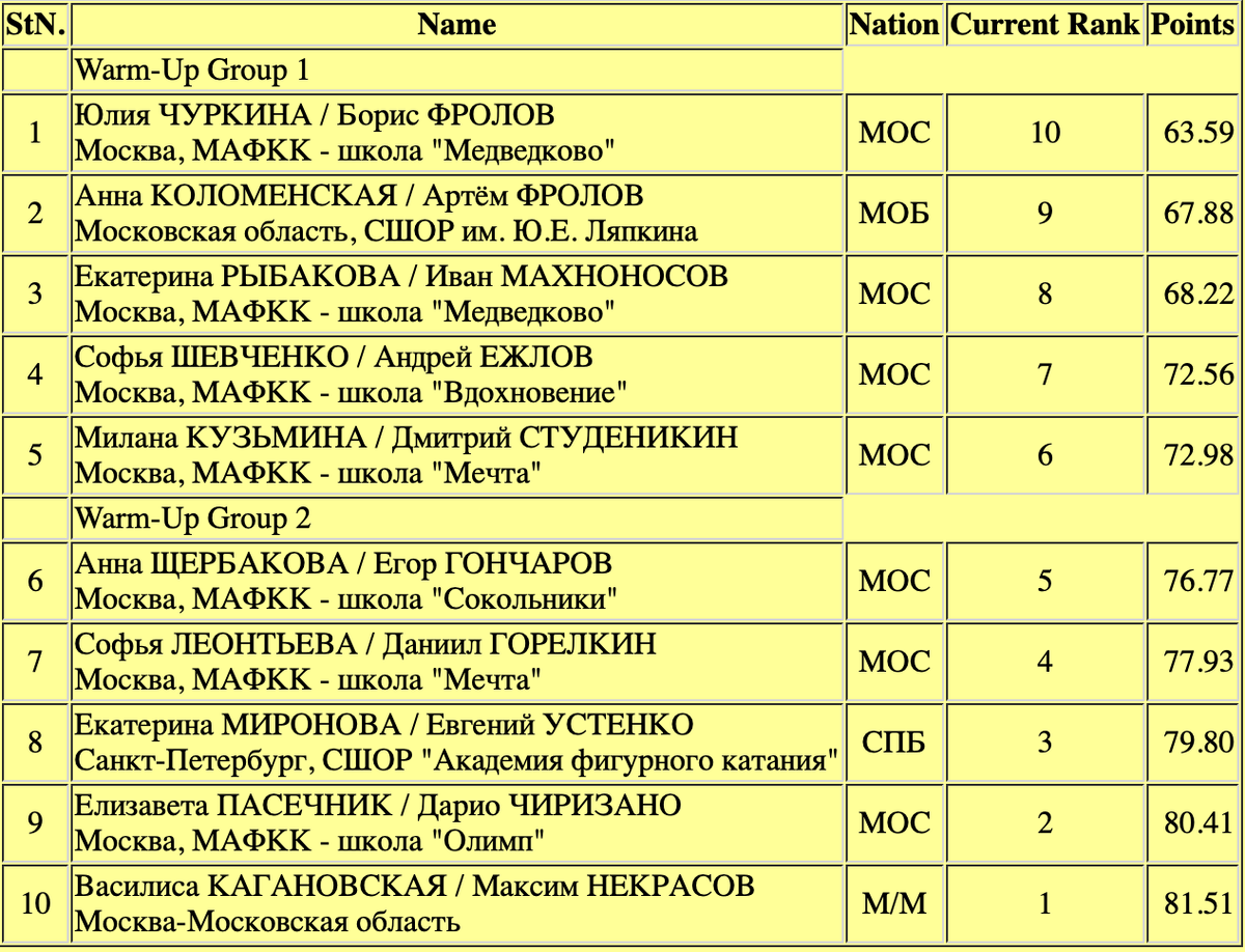 Поддержка на месте - 4 уровень. Твизлы 4 уровня у обоих. Дорожка по серпантину 2 и 3 уровня. Танцевальное вращение - 4 уровень. Блок шагов на одной ноге - 2 уровень у обоих. Хорео слайдинг без сбоев. Хорео прыжок в конце хороший. Катались вместе, именно в паре, а не каждый сам по себе. Приятная музыка, красивая постановка, в первой части бешеная скорость. С настроением. Оставили после себя самое приятное впечатление.