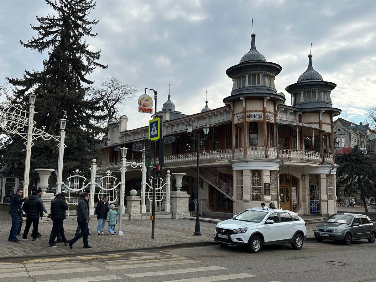 У самого входа в Цветник взгляды жителей и гостей Пятигорска привлекает легкое, воздушное и изящное здание в стиле модерн. Это кофейня Гукасова. В начале XX века курорты переживали свой расцвет, количество приезжающих увеличивалось каждый год, а точек общественного питания не хватало. Идея построить в парке «Цветник» новую большую кофейню пришла в голову местному кондитеру Александру Александровичу Гукасову, который имел уже одну кондитерскую с кофейней неподалеку. Гукасов предложил городским властям построить на пустующем местечке, которое находилось напротив Казенной гостиницы, новую кофейню. Он предлагал передать ее в собственность городу, а сам оставался бы только ее арендатором. Проект был разработан городским архитектором С.И. Гущиным в 1905 году и был одобрен городской администрацией. Противником строительства выступило Управление КМВ. В то время было запрещено по закону строить частные здания в тех местах, где выходили минеральные источники, а кофейня строилась на границе пар
