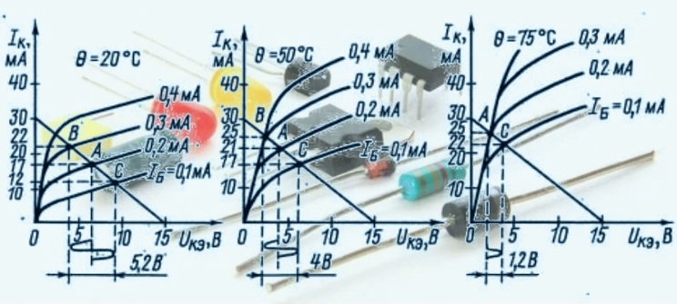 Другое дело ВАХ транзисторов, которые совмещают в себе 2 цепи: управляющую и силовую. График входной линии будет похож на диод, но привязан к напряжению питания, выходной – зависит от входного сигнала. Поэтому графики биполярных транзисторов прямой ветви ВАХ примерно будут выглядеть так, как на рисунке ниже. Входная характеристика тока базы от напряжения база/эмиттер а) зависит от напряжения в силовой цепи: коллектор/эмиттер. А кривая тока коллектора б) силовой цепи зависит от тока базы (управления).