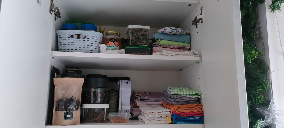 А я всё же продолжаю свои уборку и расхламовку. Сегодня на очереди две полки над специями. Чего тут только нет. Здесь находится чайная полка (чай, всякие добавки для него), полотенца кухонные и на самом верху запасы специй. Вытащив оттуда всё, удивилась, насколько грязные полки. Хотя даже года не прошло, как я пользуюсь этой кухней. Однозначно надо разбирать и протирать их примерно раз в 4 месяца. Всё рассортировала, выкинула пару трав, что подпортились от неправильного хранения и парочку того, что совсем не пьём. К примеру цветы жасмина и розы лежали три года, ни разу не использовали. Решила выкинуть. Зато поближе достала сушёную липу запас, ее мы любим. На самом деле, разобрав эти полки у меня ушли 2 банки и стало понятно, что надо допить в первую очередь (занимает место, хотя там совсем капелюшка осталась) Полотенца, что там лежали пока убрала в другое место, попробую где удобнее окажется. Как итог у меня суммарно освободилась целая полка Сейчас меня тут всё устраивает, посмотрим,