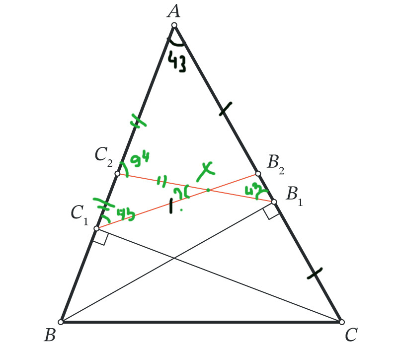 Угол A остроугольного треугольника ABC равен 43∘. BB1 и CC1 — высоты треугольника, B2 и C2 — середины сторон AC и AB соответственно. Найдите величину острого угла между прямыми B1C2 и C1B2. С1В2 и В1С2 - это медианы проведенные из прямого угла, а значит они равны половине гипотенузы. Получается треугольники АС2В1 и АС1В2 равнобедренные и поскольку угол А нам известен, все остальные углы легко вычисляются. Обращаемся к треугольнику ХС1С2. Нужно найти угол Х, внешний угол С2 равен 94 и одновременно с этим равен сумме углов Х и С1, а значит С1 равен 51 градус. Ответ: 51 Другие задачи раздела