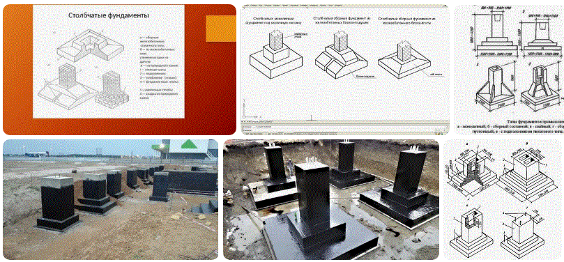 Сами столбы для фундаменты различны для разных конструкций (зависит от количества этажей и общей массы здания), и могут быть изготовлены из камня, кирпича, бетона, железобетона и т. д.