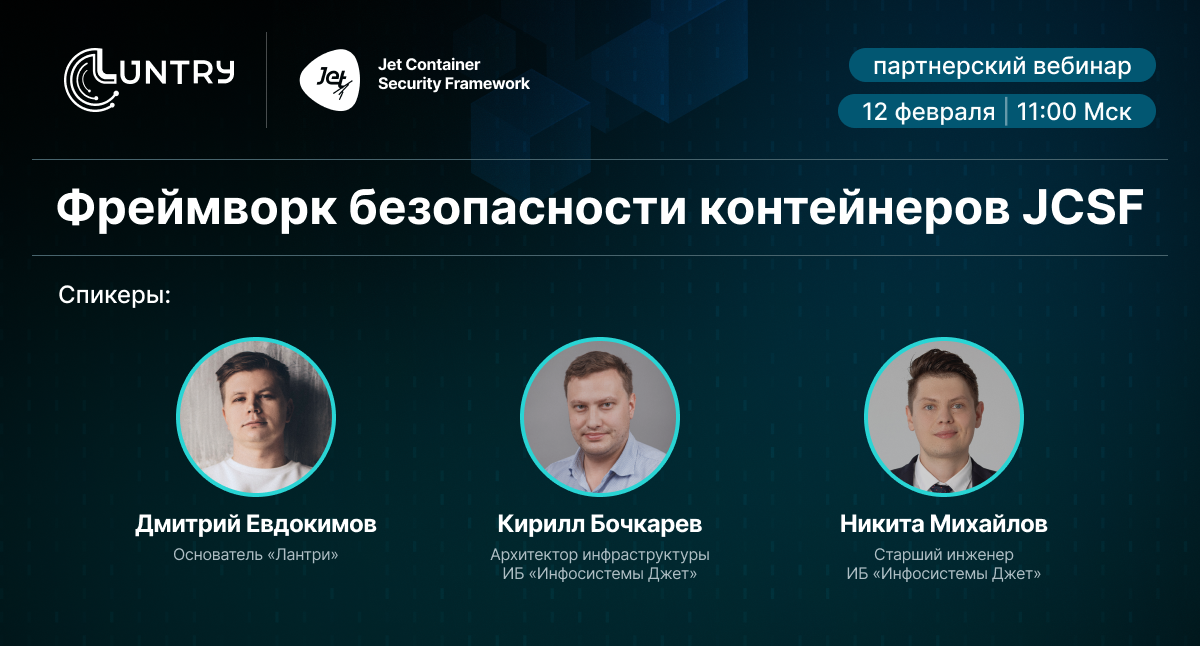 12 февраля в 11:00 пройдет совместный вебинар Luntry и компании «Инфосистемы Джет» «Фреймворк безопасности контейнеров JCSF». Для оценки уровня безопасности контейнерного окружения компании используют зарубежные NIST 800-190, CIS Kubernetes benchmark, CIS Docker benchmark или изучают премудрости 118 приказа ФСТЭК России. Но все они не дают ответ, в какой последовательности все практики необходимо выполнять. Недавно наши друзья из «Инфосистемы Джет» создали и выложили в открытый доступ свой фреймворк по мерам безопасности контейнерных сред и сред контейнерной оркестрации – Jet Container Security Framework (JCSF). Такое случается далеко не каждый день, и мы решили собраться и обсудить его предысторию, развитие, нюансы и поделится нашим опытом по аудитам контейнерных сред. Зарегистрироваться на вебинар можно по ссылке.