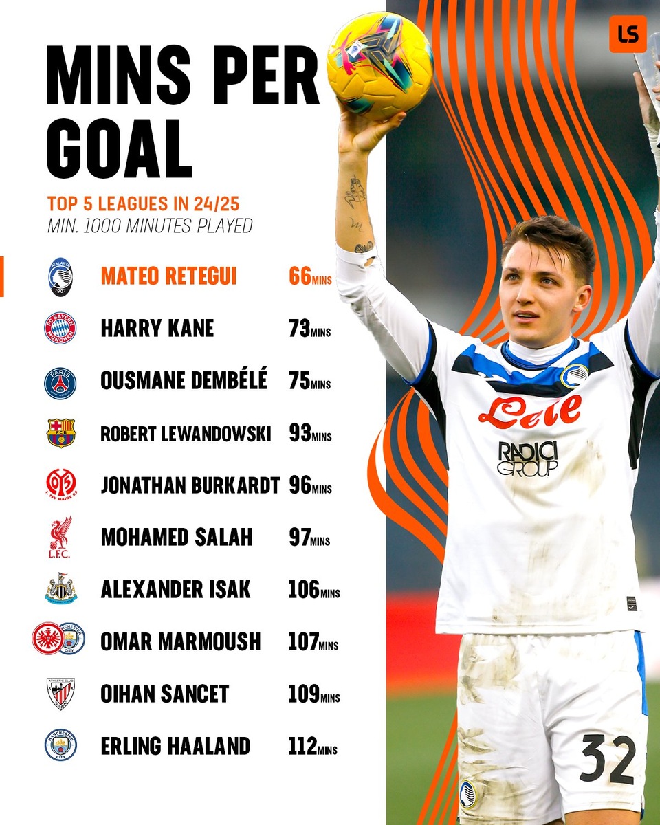 В матче 24-го тура Серии А между «Вероной» и «Аталантой» Матео Ретеги оформил покер – у нападающего уже 20 голов в чемпионате Италии. Портал LiveScore составил топ самых результативных бомбардиров, которым в этом сезоне нужно наименьшее количество игрового времени на гол. В рейтинг вошли игроки, проведшие минимум 1000 минут в топ-5 лиг Европы. Ретеги, занявший первую строчку рейтинга, в среднем забивает каждые 66 минут. На втором месте расположился Харри Кейн – нападающему «Баварии» для гола нужно 73 минуты. Замыкает тройку лучших Усман Дембеле, который отличается каждые 75 минут. Как вам такой взгляд на результативность? Участники плей-офф ЛЧ усилились зимой! Смотрим, каких игроков добавили в заявку все клубы 📸🎥 Крутейшее ретро от «Баварии»! Мюллер и Павлович отправились в прошлое – на 125 лет назад 🔥 Сравниваем результативность Месси и Роналду по годам. Статистика за 14 лет