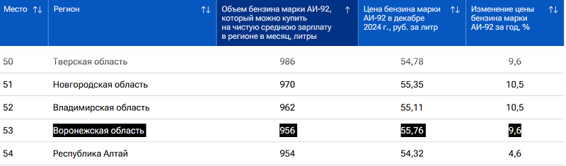 Среднестатистический воронежец на свою зарплату может позволить себе аж в 2,5 раза меньше бензина, чем москвич на свою. В рейтинге российских регионов по доступности бензина Воронежскую область так просто не найти. Придется сперва хорошенько поработать колесиком мыши. Дорогой сердцу регион обнаружится аж на 53 строчке, рядышком с Алтаем. Среднестатистическая зарплата воронежца «вмещает» в себя лишь 956 литров бензина марки АИ-92. За 2024 год он подорожал у нас на 9,6%. Для сравнения, белгородец может купить 1002 литра, липчанин – 1009, а вот тамбовчанин наоборот, еще меньше – 835 литров. Доступней всего, как ни странно, бензин в Москве и на северах (просто в виду больших зарплат). Несмотря на более дорогой бензин, жители Чукотки способны купить на свою зарплату 2296 литров в месяц, Ямала – 2414 – литров, а москвичи – 2421 литр. Наиболее острую недоступность бензина ощущают жители Дагестана, Чечни и Ингушетии. На свою зарплату они могут купить лишь 625-676 литров топлива. Номинально же