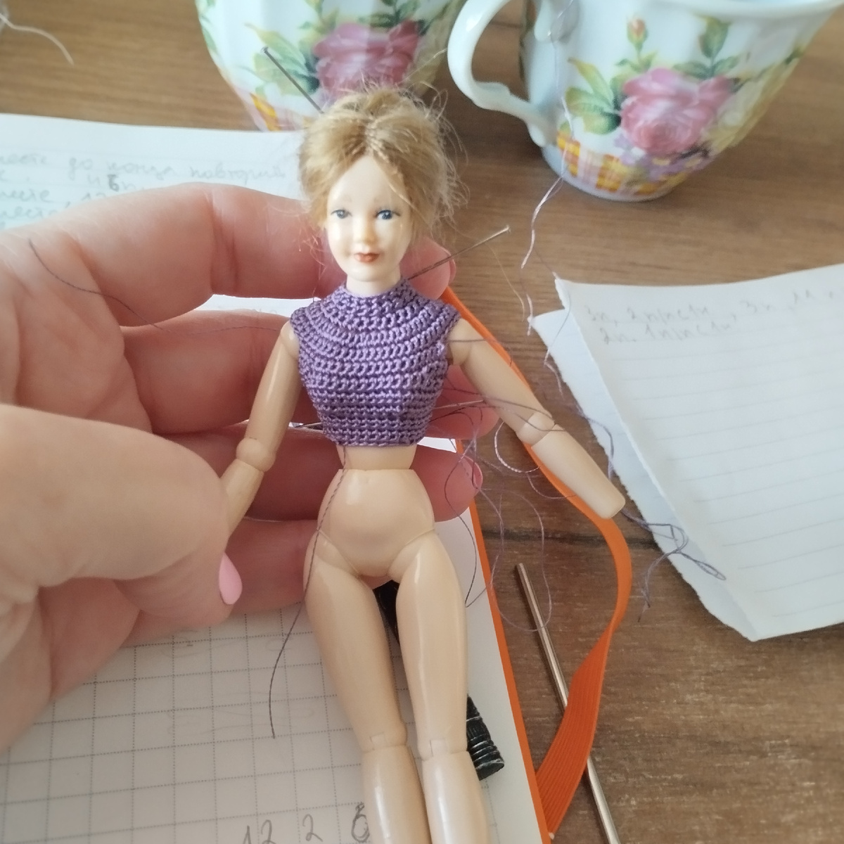 Описание платья "Домашнее" викторианское для леди от Хайди Отт. Нитки от Гамма вискоза, вышивальные номер 3481,крючок 0,5., спицы 1 мм 5 штук, если пять нет, то вязать на двух, но у вас будет шов на юбке по спинке. Вяжем в две нитки. Плотность не считала, вяжу плотно. Горловина. Набрать 21 в. п. провязать три ряда столбиков без накида. 4 ряд : петля подъёма, ст без нак, 2 ст без нак в одну, повторять до конца, 31 петля 5 ряд: петля подъёма, 31 ст без нак. 6 ряд: петля подъёма, ст без нак, далее в каждую по 2 ст без нак, последний ст без нак. 60 петель 7 ряд: 60 петель 8 ряд: 60 петель 9 ряд: 60 петель Первая полочка спинки Петля подъёма, 11 ст без нак, поворот Петля подъёма, 3 ст без нак, поворот Не делать петлю подъёма, 3 ст без нак, поворот Петля подъёма, 11 ст без нак, поворот Петля подъёма, 11 ст без нак, оборвать нить. Пропустить 9 петель на рукав. Полочка ( далее пп это петля подъёма) Присоединить нить, пп, 20 ст без нак, повернуть, пп, 3 ст без нак, повернуть, 3