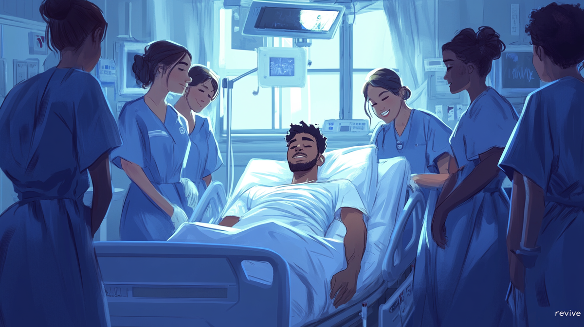 На иллюстрации мы видим мужчину в больничной палате, окружённого несколькими медсестричками, которые, похоже, чрезмерно стараются его «реанимировать». Вместо того чтобы помочь, их усердие буквально «давит» на пациента, и он выглядит полностью опустошённым.