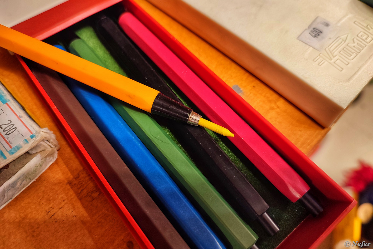 Однажды в магазине "Антресоль" мне попались карандаши "Кимек". Я такими рисовала в детстве. Они появились в начале 80-х и казались очень прогрессивными. Обычные деревянные карандаши ломаются, их надо точить, стружки уходят в отходы, а тут даже маленький кусочек грифеля можно зажать в цангу и использовать - просто супер!
